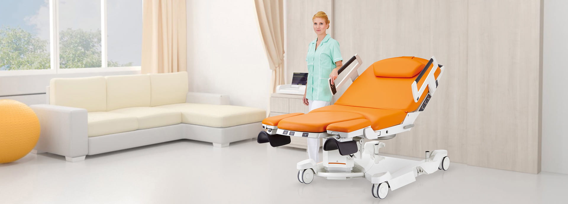 Die elektrische Einstellung der Beckenneigung ermöglicht eine optimale Position zur Behandlung von Geburtsverletzungen.