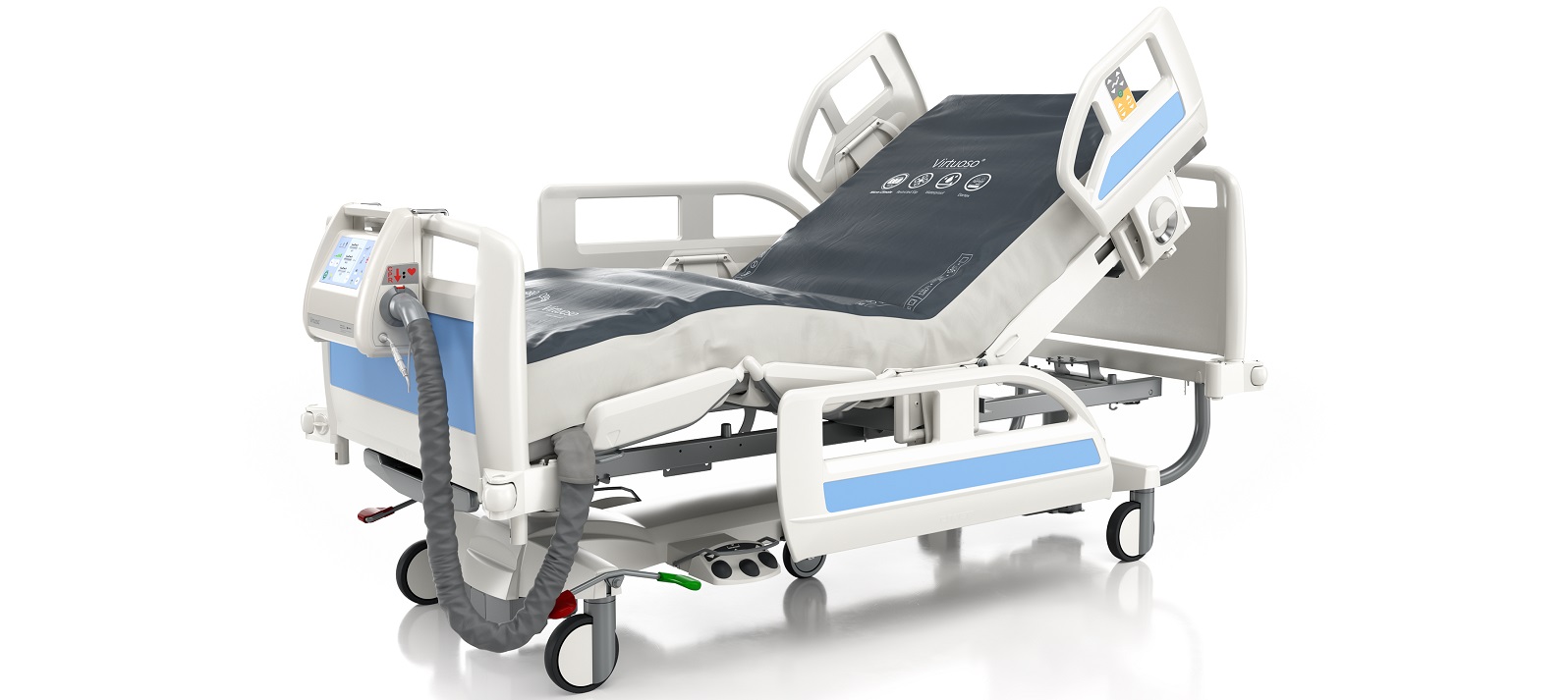 The Virtuoso system control unit (SCU) is designed with ergonomics and ease of handling in mind. It is easy to carry and to mount on the bed. The simple to use front panel controls with clear graphical symbols makes operation easy to learn and remember. It is possible to connect 6 different mattresses and 1 alternating seat cushion to 1 single SCU.