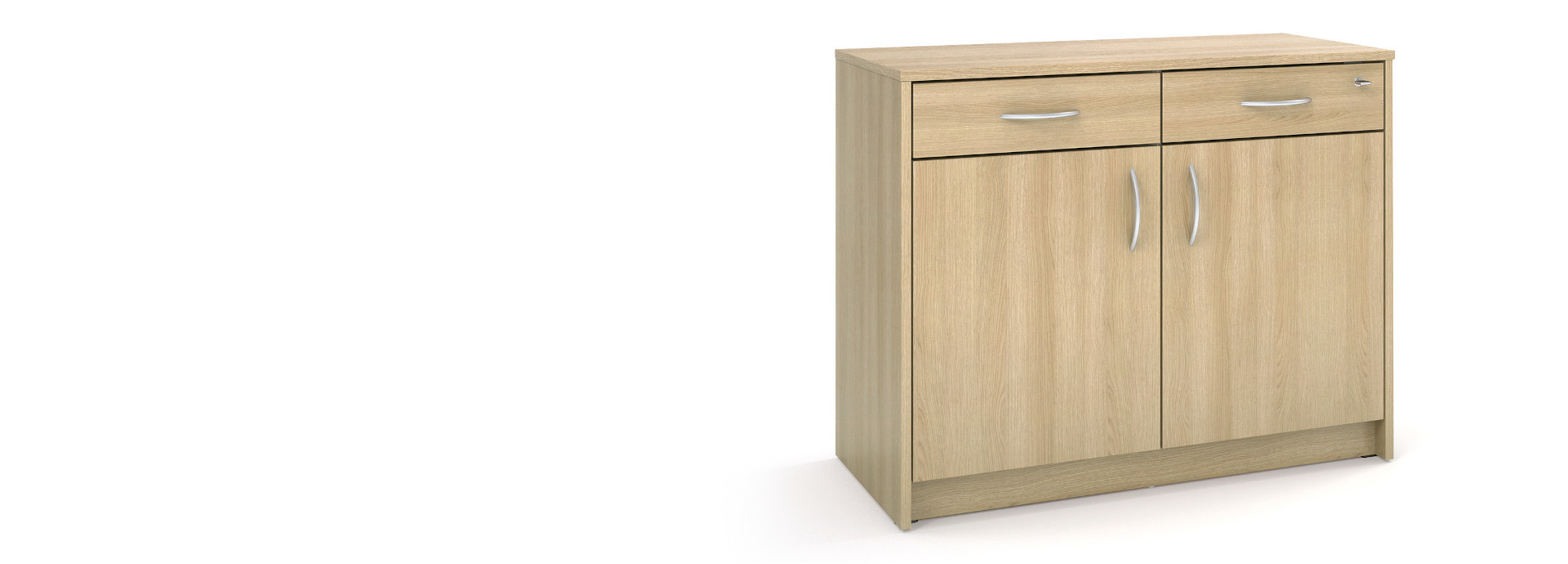 Dresser with 2 drawers in upper part and two large doors. The dresser offers plenty of storage space and can be easily opened and closed thanks to the 128 mm curved segment handles. Integrated drilled soft-closes reduce the noise level when closing the doors.