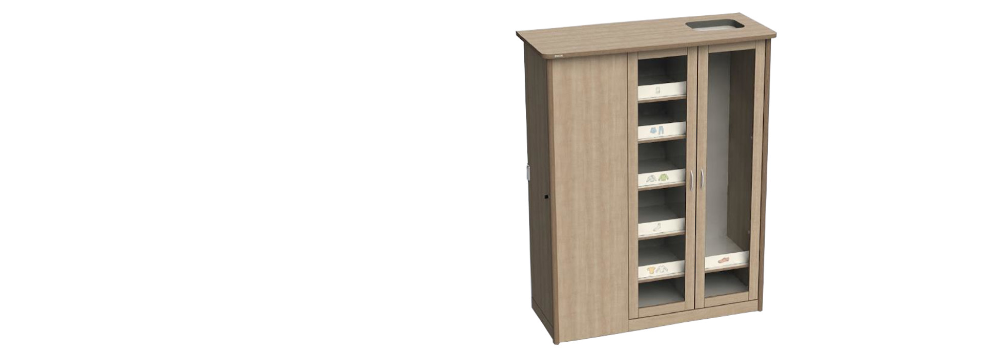 A wardrobe especially designed for residents suffering from dementia and the nursing staff providing care. Thanks to the two-color design, the outline can be seen better by the resident, minimizing the risk of injuries. The rounded edges also increase safety. Through the transparent doors, the contents of the wardrobe can be seen at first glance. A separate nurse compartment is integrated on the side of the wardrobe. This is suitable for storing care products without the resident noticing it.